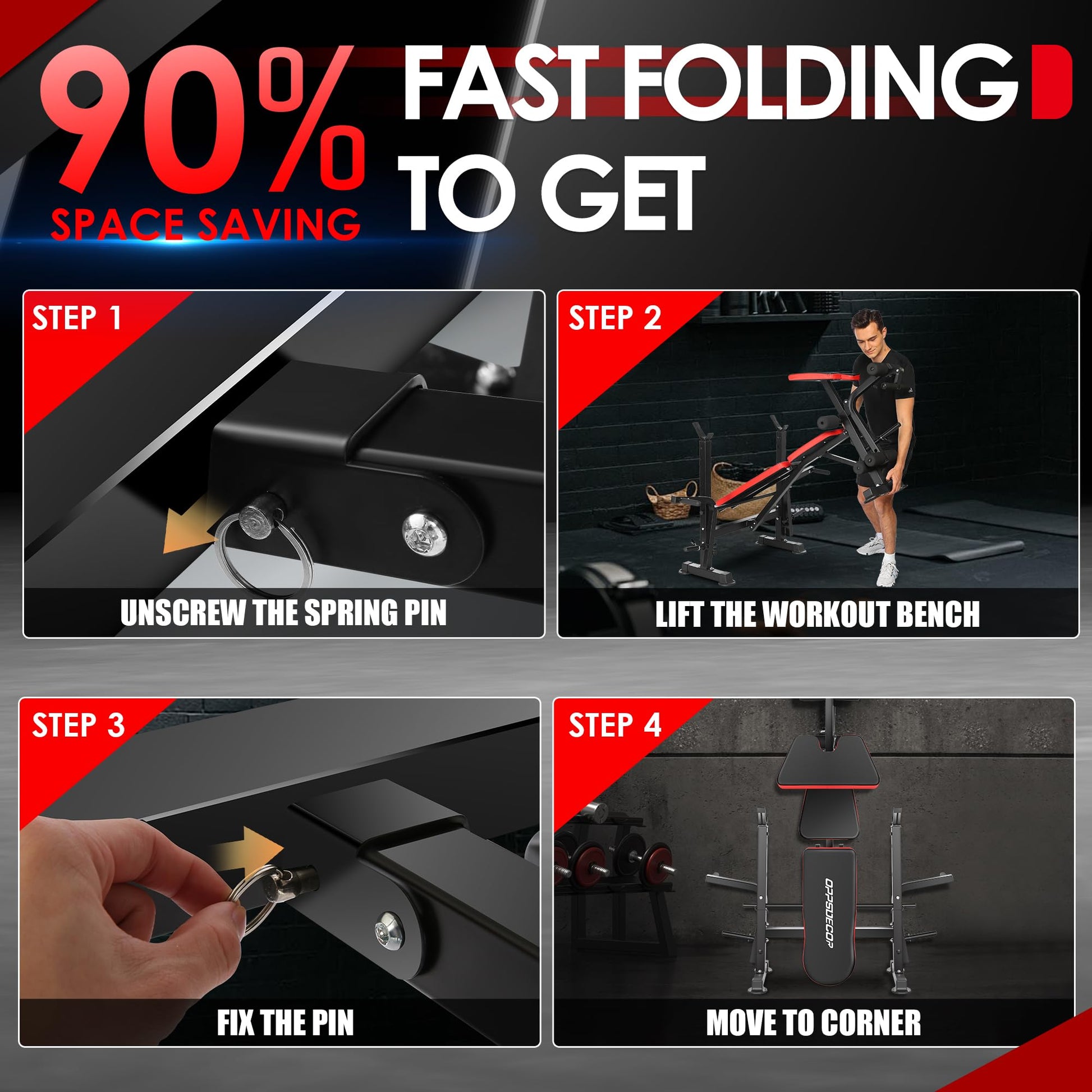 - [Foldable & Adjustable]: You can make different adjustments according to your different needs. Backrest adjusts for flat/incline positions. Adjustable uprights can be adjusted to 5 levels. Height adjustable and folded design brings more convenience to your exercising.