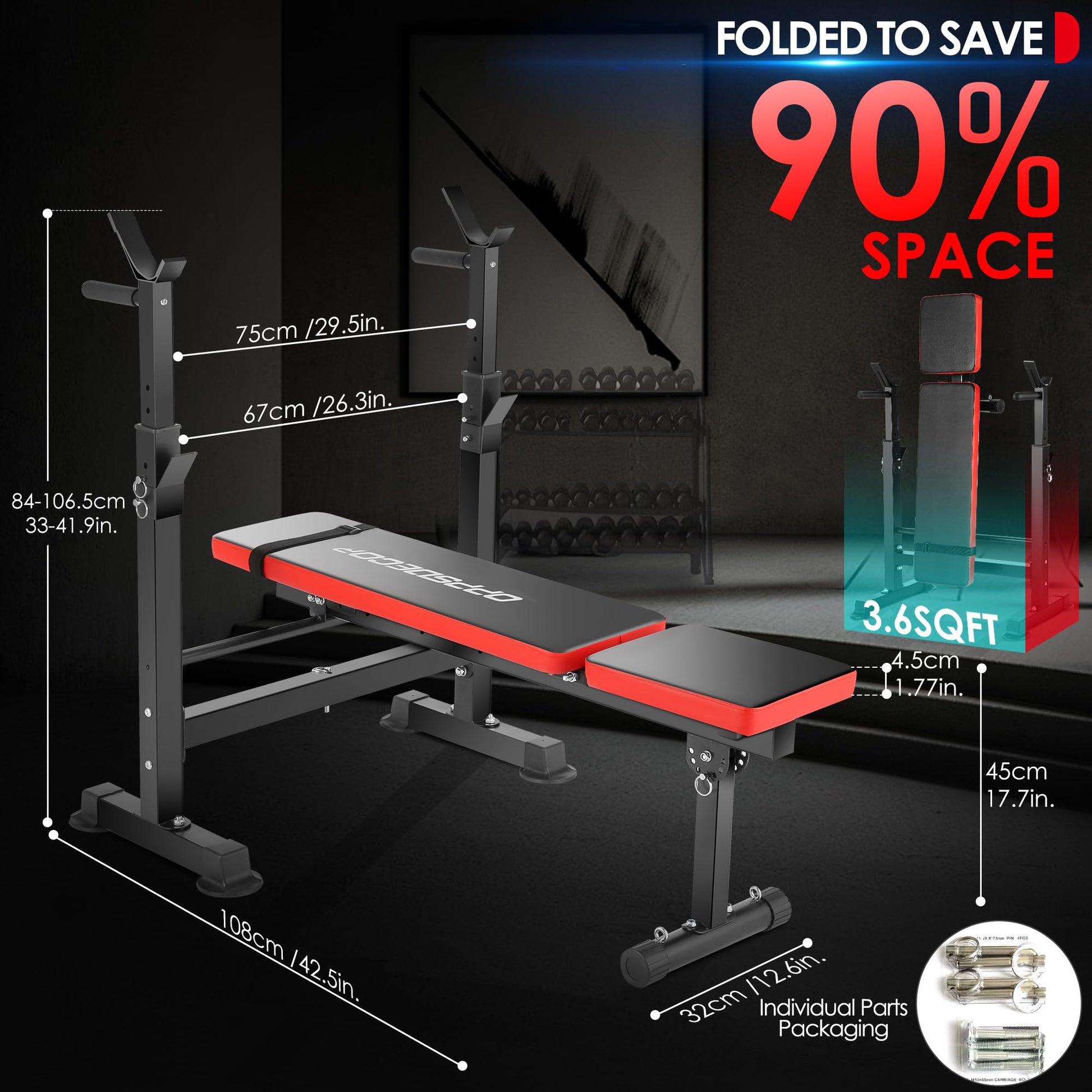 - [Foldable & Adjustable]: You can make different adjustments according to your different needs. Backrest adjusts for flat/incline positions. Adjustable uprights can be adjusted to 5 levels. Height adjustable and folded design brings more convenience to your exercising.